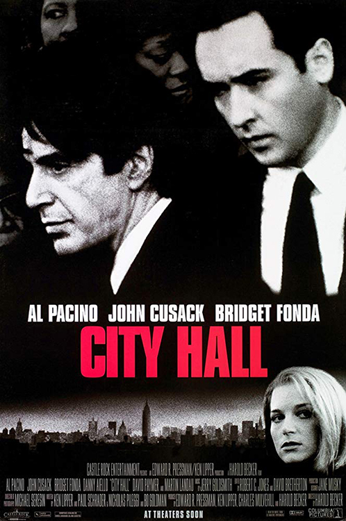 CITY HALL (1996) DIR Harold Becker PROD Harold Becker, Ken Lipper, Edward R. Pressman, Charles Mulvehill SCR Paul Schrader, Ken Lipper, Bo Goldman, Nicholas Pileggi CAM Michael Seresin ED David Bretherton, Robert C. Jones MUS Jerry Goldsmith CAST Al Pacino (Mayor John Pappas), John Cusack, Bridget Fonda, Danny Aiello, Martin Landau, David Paymer, Anthony Franciosa, Richard Schiff