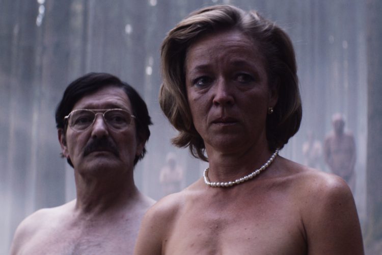 Wel ja, dat is het hé. Ik had ook zoiets van, ‘Ik als Ariane naakt? Nee, dat hoeft niet.’ Maar ik begreep heel goed het concept, waarom Tim die nudistencamping had gekozen als setting, en hoe mijn personage zich daarin beweegt. Ik had ook een enorm kapsel en droeg een parelketting, en het personage van Liliane was enorm begaan met haar kapsel: dat bepaalde mee hoe en wie ze was. Ik stond er dus niet als mezelf, ik was héél duidelijk Liliane, en ik voelde dat van bij het begin. Ik had met Tim besproken welk kapsel ze zou hebben en vóór de film ging ik dus naar de kapster—in dit geval was dat kapsel superbelangrijk, want normaal zijn het de kleren die het personage voor een groot deel mee bepalen. Daarom was het voor mij belangrijk om te weten, ‘Wat voor iemand is Liliane?’ Haar kapsel was het enige dat ze had, en toen ik uiteindelijk het juiste kapsel had en ik keek in de spiegel, dacht ik, ‘Oh ja, nu weet ik wat voor vrouw ze is.’ Op dat moment besefte ik dat ik er niet als mezelf zou staan, en dan vind ik het prachtig dat deze vrouw met dit kapsel in haar blootje rondliep. Maar als Ariane vond ik het die eerste draaidag wel erg spannend—het moment dat je je kamerjas moet uitdoen en daar ga je dan, dat was even ‘Oehoe…!’ Maar dat was heel snel voorbij, vijf minuten later was het okee. In zekere zin was het zelfs zo okee dat je weet dat iedereen je al heeft gezien, iedereen kan je imperfecties zien, en je hoeft de schijn niet meer op te houden. Het gaf me een rustig gevoel. Ik was niet meer bezig met hoe ik zou overkomen. Ik dacht gewoon, ‘Dit ben ik.’ In die zin was het bevrijdend, grappig genoeg, en het viel ontzettend mee. In het begin zag ik er tegenop, maar ik wist dat de film met Tim in goede handen was, hij wist zo goed waar hij mee bezig was, dat ik dacht, ‘Ja, het komt wel goed.’ Ik zou deze rol niet zomaar bij eender wie hebben gespeeld. Mocht het een andere regisseur zijn geweest waarin ik minder vertrouwen had, dan weet ik niet of ik dat gedaan had. Maar nu wist ik het wel.
