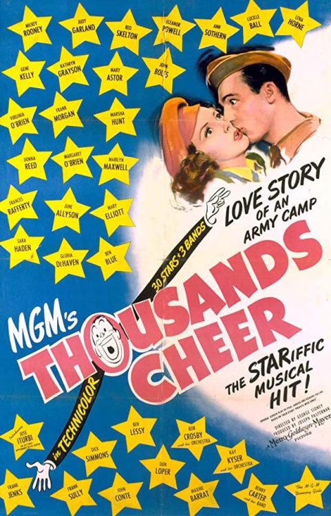 THOUSANDS CHEER (1943) DIR George Sidney PROD Joe Pasternak SCR Paul Jarrico, Richard Collins (verhaal ‘Private Miss Jones’ van Paul Jarrico, Richard Collins) CAST Kathryn Grayson, Gene Kelly, Mary Astor, John Boles, Ben Blue, Mickey Rooney, Judy Garland, Red Skelton, Eleanor Powell (Herself), Ann Sothern, Lucille Ball, Virginia O’Brien, Frank Morgan, Lena Horne, Marsha Hunt, Marilyn Maxwell, Donna Reed, Margaret O’Brien, June Allyson, Gloria DeHaven, Cyd Charisse