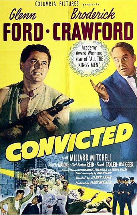 CONVICTED (1950) DIR Henry Levin PROD Jerry Bresler SCR Fred Niblo Jr., William Bowers, Seton I. Miller (toneelstuk ‘Criminal Code’ van Martin Flavin) CAST Glenn Ford (Joe Hufford), Broderick Crawford, Millard Mitchell, Dorothy Malone, Carl Benton Reid, Will Geer
