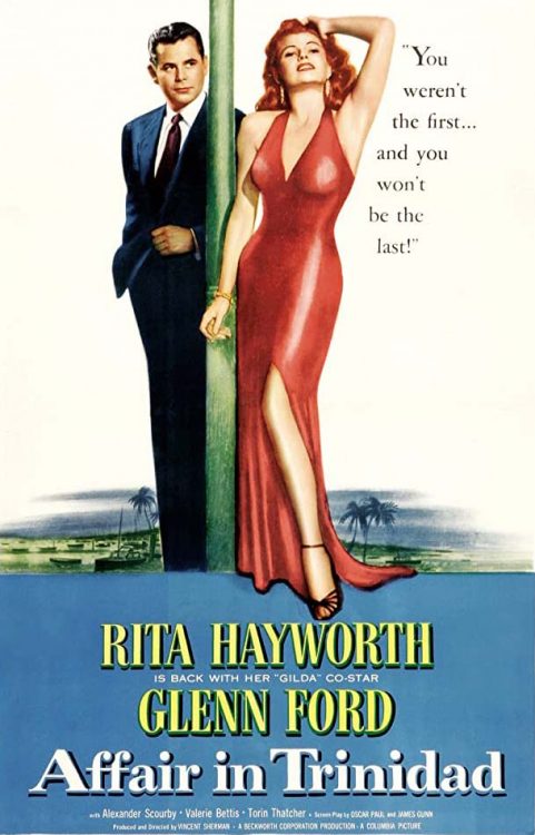 AFFAIR IN TRINIDAD (1952) DIR – PROD Vincent Sherman SCR Oscar Saul, James Gunn (verhaal van Virginia Van Upp, Berne Giler) CAST Rita Hayworth, Glenn Ford (Steve Emery), Alexander Scourby, Valerie Bettis, Torin Thatcher, Howard Wendell