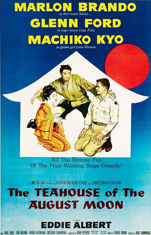 THE TEAHOUSE OF THE AUGUST MOON (1956) DIR Daniel Mann PROD Jack Cummings. Scr John Patrick (ook toneelstuk; boek van Vern J. Sneiber) CAST Marlon Brando, Glenn Ford (Captain Fisby), Machiko Kyô, Eddie Albert, Paul Ford, Jun Negami