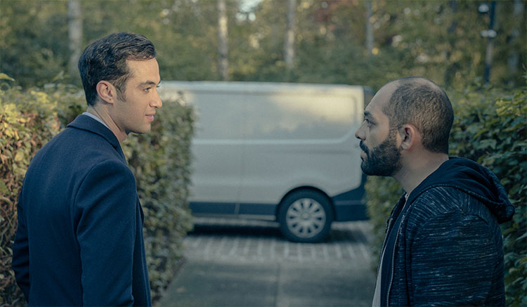 Je krijgt sowieso een bodem: het scenario is altijd je bodem. Dan laat je dat smelten met wat je zelf maakt van je personage en je bereidt je goed voor. Ik kan niet zeggen wat je als acteur moet doen, want ik ben een nieuwkomer, ben zelf nog lerende en vraag heel veel advies aan mensen die veel meer ervaring hebben dan ik. Ik heb wel een advocatenkantoor bezocht om eens goed te kijken hoe en wat een advocaat precies doet. Want je kan wel een advocaat spelen, maar je houding is misschien nog teveel zoals in “Grond.” Er zijn zoveel kleine dingen waarop je moet letten: hoe je zit, staat, praat, enz. Maar de grootste uitdaging voor mij was wel het thema van liefde. Niet zoals in “Grond” wanneer je bijvoorbeeld verliefd bent op de zus van je beste vriend; dan staat alles nog erg dichtbij. Maar écht liefde, met iemand die gesetteld is, de liefde van zijn leven vindt en daarover communiceert, dat was voor mij een nieuwe wereld. Voor Lauren [Versnick] was het haar eerste hoofdrol en chapeau hoe ze dat heeft gedaan, want er ligt dan altijd veel druk op je schouders—ik weet van bij “Grond” hoeveel er op je afkomt—en je mag het haar vragen: ik heb haar heel de opnameperiode enkel beschouwd als Eva, haar personage. Niet als Lauren. Ik kén Lauren niet, ik ken haar echt niet. Halim ken ik goed, Eva ken ik goed, maar Lauren ken ik niet. Dat kwam door mijn intuïtie die zei, ‘Focus dààrop om de zaken niet te mixen en om het personage goed te sturen op het vlak van liefde.’ Misschien ga ik over een jaar denken, ‘Je hebt het jezelf toen wel erg moeilijk gemaakt.’ Had ik in mijn jeugd meer gecommuniceerd over liefde, dan kon ik dingen misschien beter plaatsen. Voor mij was het in alle geval een heel kwetsbare rol. Jezelf smijten en over jezelf waken—misschien klinkt dat raar—maar dat was de balans die ik probeerde te vinden.