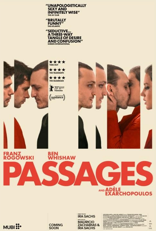 PASSAGES (2023) DIR Ira Sachs PROD Saïd Ben Saïd, Michel Merkt SCR Ira Sachs, Mauricio Zacharias CAM Josée Deshaies ED Sophie Reine CAST Franz Rogowski, Ben Wgishaw, Adèle Exarchopoulos, Erwan Kepoa Falé, Arcadi Radeff, Léa Boublil, Théo Cholbi, William Nadylam, Tony Daoud, Sarah Lisbonis