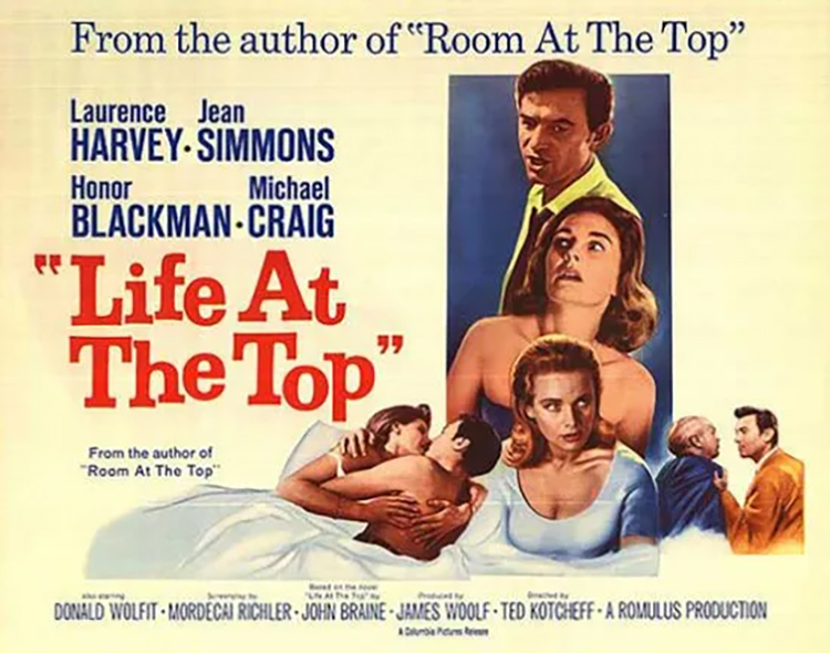 LIFE AT THE TOP (1965) DIR Ted Kotcheff PROD James Woolf SCR Mordecai Richler (boek van John Braine) CAM Oswald Morris ED Derek York MUS Richard Addinsell CAST Laurence Harvey, Jean Simmons, Honor Blackman, Michael Craig, Donald Wolfit, Robert Morley, Margaret Johnston, Edward Fox