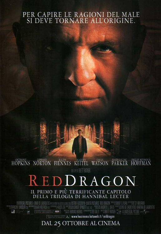 RED DRAGON (2002) DIR Brett Ratner PROD Dino De Laurentiis, Martha De Laurentiis SCR Ted Tally (boek “Red Dragon” [1981] van Thomas Harris) CAM Dante Spinotti ED Mark Helfrich MUS Danny Elfman CAST Anthony Hopkins, Edward Norton, Ralph Fiennes, Harvey Keitel, Emily Watson (Reba McClane), Mary-Louise Parker, Philip Seymour Hoffman, Anthony Heald, Ken Leung, Lalo Schifrin, Mary Beth Hurt