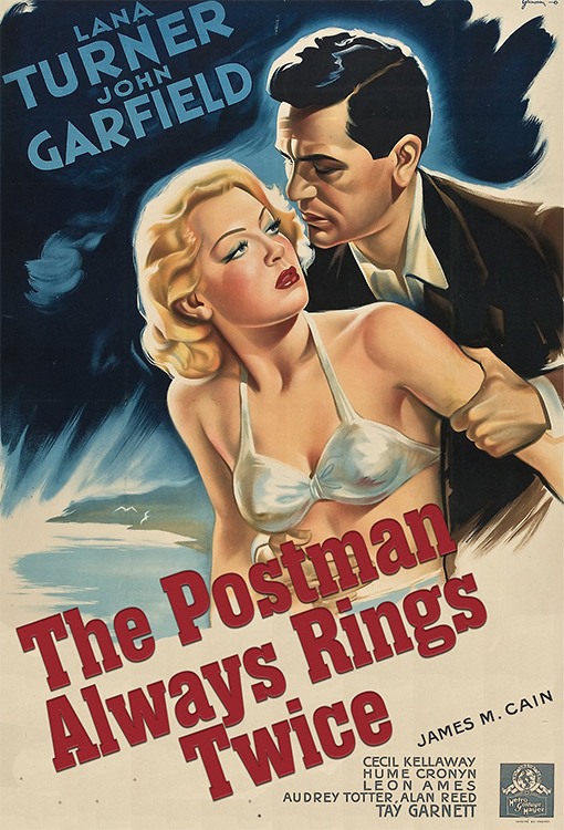 THE POSTMAN ALWAYS RINGS TWICE (1946) DIR Tay Garnett PROD Carey Wilson SCR Niven Busch, Harry Ruskin (boek “The Postman Always Rings Twice” [1934] van James M. Cain) CAM Sidney Wagner ED George White MUS George Bassman CAST Lana Turner, John Garfield (Frank Chambers), Cecil Kellaway, Hume Cronyn, Leon Ames, Audrey Totter, Alan Reed, Jeff York
