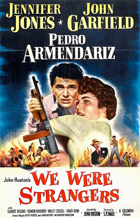 WE WERE STRANGERS (1949) DIR John Huston PROD Sam Spiegel SCR John Huston, Peter Viertel (gebaseerd op een episode in het boek “Rough Sketch” [1948] van Robert Sylvester) CAM Russell Metty ED Al Clark MUS George Antheil CAST Jennifer Jones, John Garfield (Tony Fenner), Pedro Armendiraz, Gilbert Roland, Ramon Navarro, Wally Cassell, David Bond, José Pérez