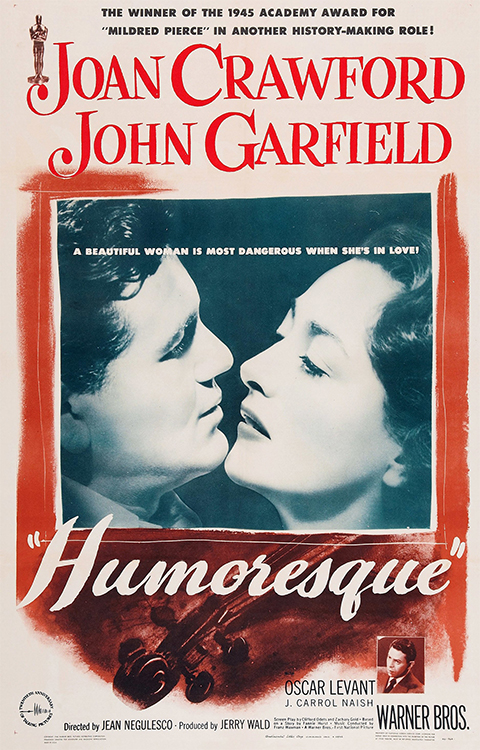HUMORESQUE (1946) DIR Jean Negulesco PROD Jerry Wald SCR Clifford Odets, Zachary Gold (kort verhaal “Humoresque” [1919] van Fannie Hurst) CAM Ernest Haller ED Rudi Fehr CAST Joan Crawford, John Garfield (Paul Boray), Oscar Levant, J. Carrol Naish, Joan Chandler, Tom D’Andrea, Peggy Knudsen, Ruth Nelson, Craig Stevens, Bobby Blake