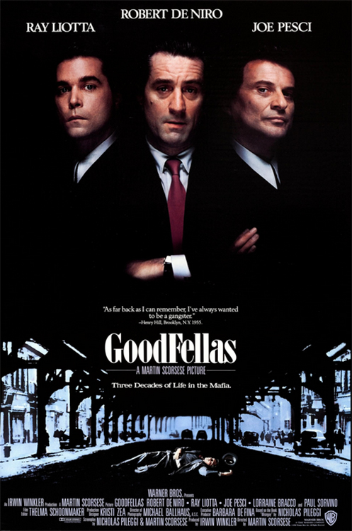 GOODFELLAS (1990) DIR Martin Scorsese PROD Irwin Winkler SCR Nicholas Pileggi, Martin Scorsese (boek “Wiseguy: Life in a Mafia Family” [1985] van Nicholas Pileggi) CAM Michael Ballhaus ED Thelma Schoonmaker CAST Robert De Niro, Ray Liotta, Joe Pesci, Lorraine Bracco, Paul Sorvino, Frank Sivero, Tony Darrow, Mike Starr, Julie Garfield (Mickey Conway)