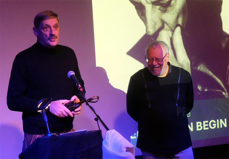 Afgelopen vrijdag, op 21 november, werd de Vlaamse acteur Peter Van den Begin (geb. 1964) in Filmhuis Klappei te Antwerpen gevierd. Hij werd er onderscheiden met de Gulden Mira, een filmprijs die ieder jaar tijdens de 7 Dagen van de Sociale Film in Klappei wordt uitgereikt door de Vereniging van de Vlaamse Filmpers. Foto bovenaan (copyright Adam Munro): Van den Begin tijdens zijn dankwoord, geflankeerd door VVF-voorzitter Lukas De Vos.