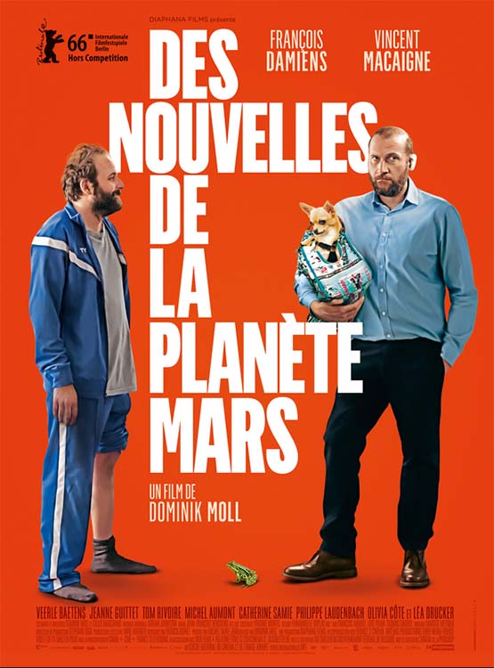DES NOUVELLES DE LA PLANÈTE MARS (2016) DIR Dominick Moll PROD Michel Saint-Jean SCR Dominick Moll, Gilles Marchand CAM Jean-François Hensgens ED Margot Meynier MUS Adrian Johnston CAST François Damiens, Vincent Macaigne, Veerle Baetens, Jeanne Guittet, Tom Rivoire, Michel Aumont, Catherine Samie, Léa Drucker